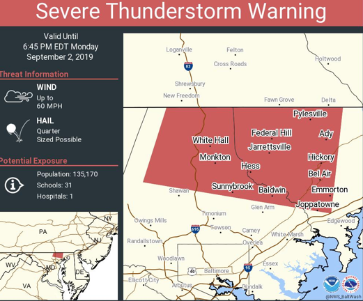 The National Weather Service issued a severe thunderstorm warning for parts of Harford and Baltimore counties. It expired at 7:15 p.m. on Monday, Sept. 2.