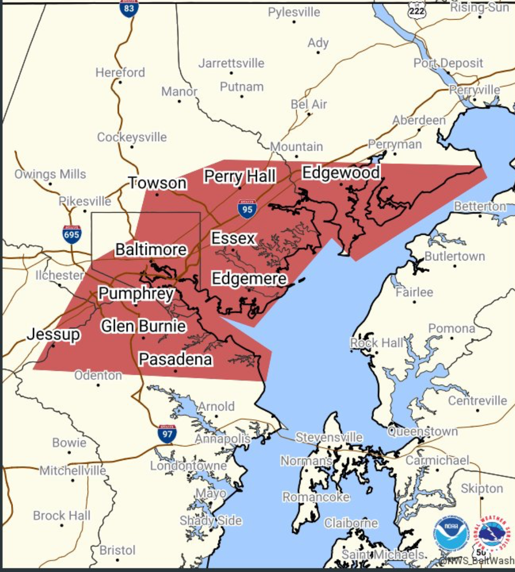 Locations impacted include the following, according to the National Weather Service: Baltimore, Severn, Middle River, Riviera Beach, Aberdeen Proving Ground, North Point State Park, Sparrows Point, Fort Smallwood State Park, Bodkin Point, Back River, Millers Island, Glen Burnie, Dundalk,