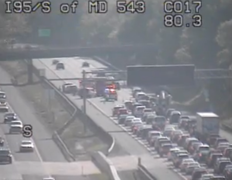 As of 5:15 p.m., two lanes were blocked on I-95 south past exit 80/MD 543, CHART reported.