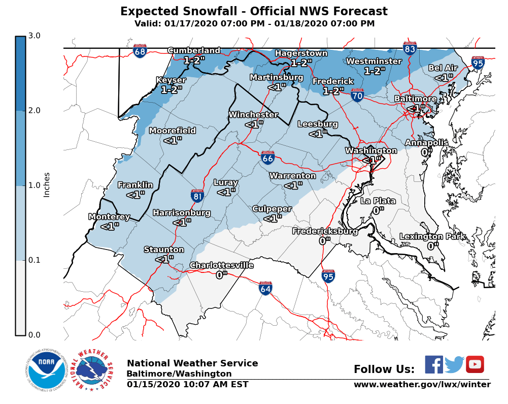 Frederick and Hagerstown are expected to get 1 inch of snow Saturday. The Inner Harbor in Baltimore may get less than an inch, and D.C. is not expected to see any accumulation, based on projections forecasters released Wednesday.