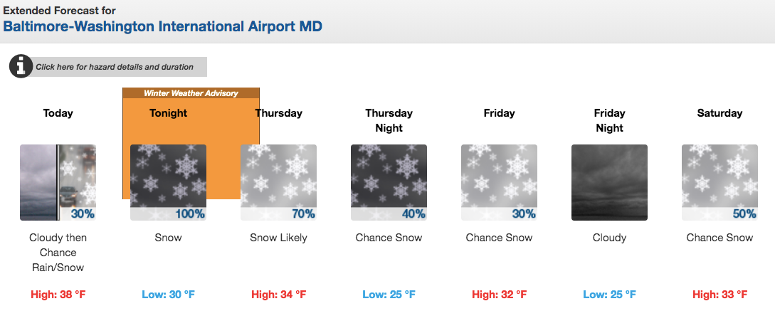 PREVIOUS REPORT— With a few inches of snow in the forecast, the National Weather Service placed the Baltimore-Washington area and surrounding regions under a winter weather advisory.