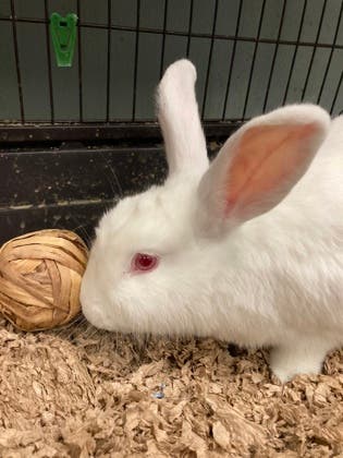 Lilly is a curious white rabbit with an endearing personality. She's quite sweet and loves to snuggle but will zoom around outside her cage and play enthusiastically with her toys.