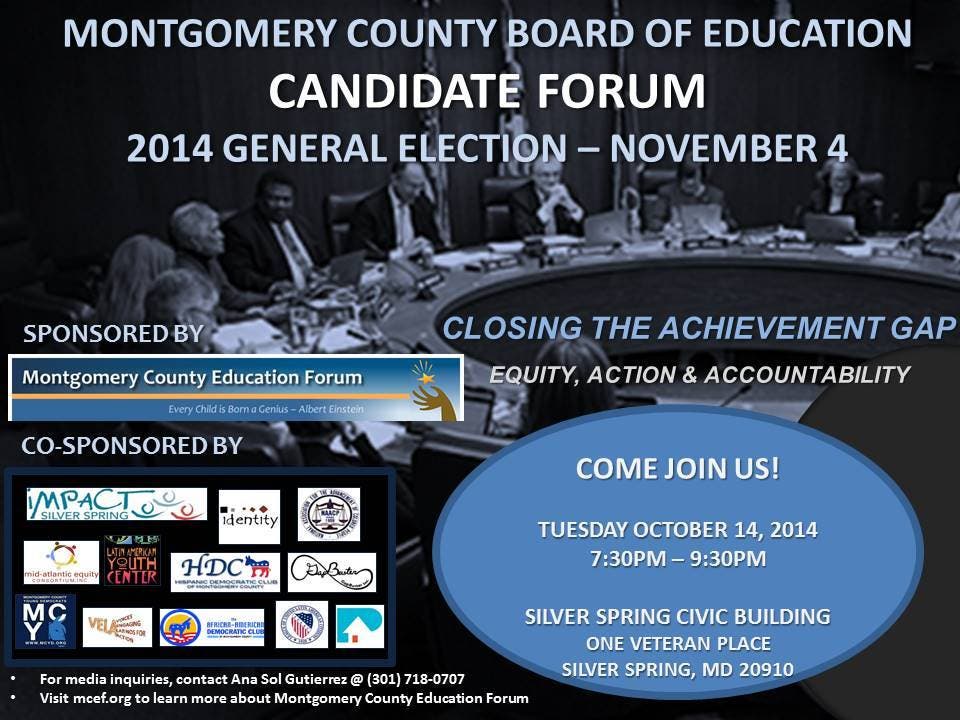 The Montgomery County Education Forum will sponsor a county Board of Education candidate forum from 7:30 to 9:30 p.m. on Tuesday, October 14, at the Silver Spring Civic Center.