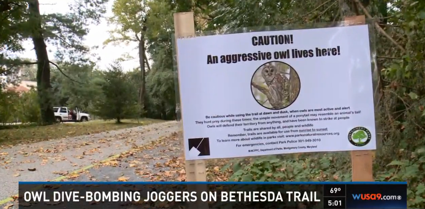 »Screenshot of Montgomery County Parks sign warning of aggressive owl, from WUSA