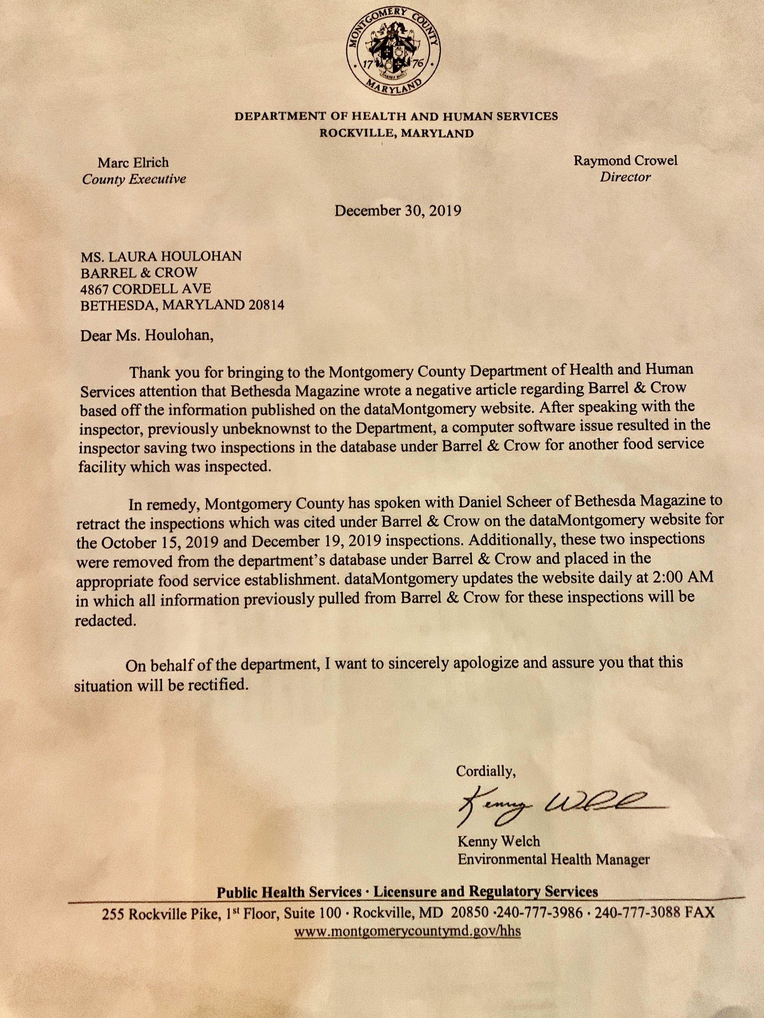 According to a letter Houlihan received from the department, Barrel and Crow was mistakenly cited for health code violations on Oct. 15 and Dec. 19. The erroneous citations, Houlihan discovered, were meant for Bethesda Bagels at Wildwood Shopping Center.
