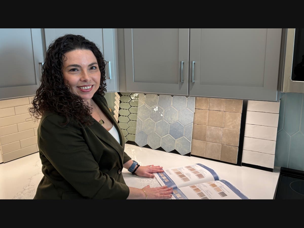 Custom Interiors Coordinator Sarah Seifollahi shows off the design catalog and some of the kitchen finishes available.