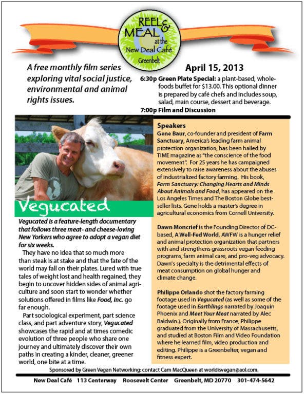 On Monday, April 15th, Reel and Meal at the New Deal Cafe will screen Vegucated. The free film screening starts at 7pm at the New Deal Cafe, located at 113 Centerway in Greenbelt's Roosevelt Center. An optional vegan buffet ($13.00) begins at 6:30pm.