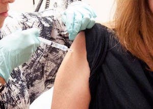 »A woman enrolled in the first test of an experimental Ebola vaccine receives a dose of the vaccine at the NIH Clinical Center in Bethesda on Sept. 2. Photo from the National Institutes of Health