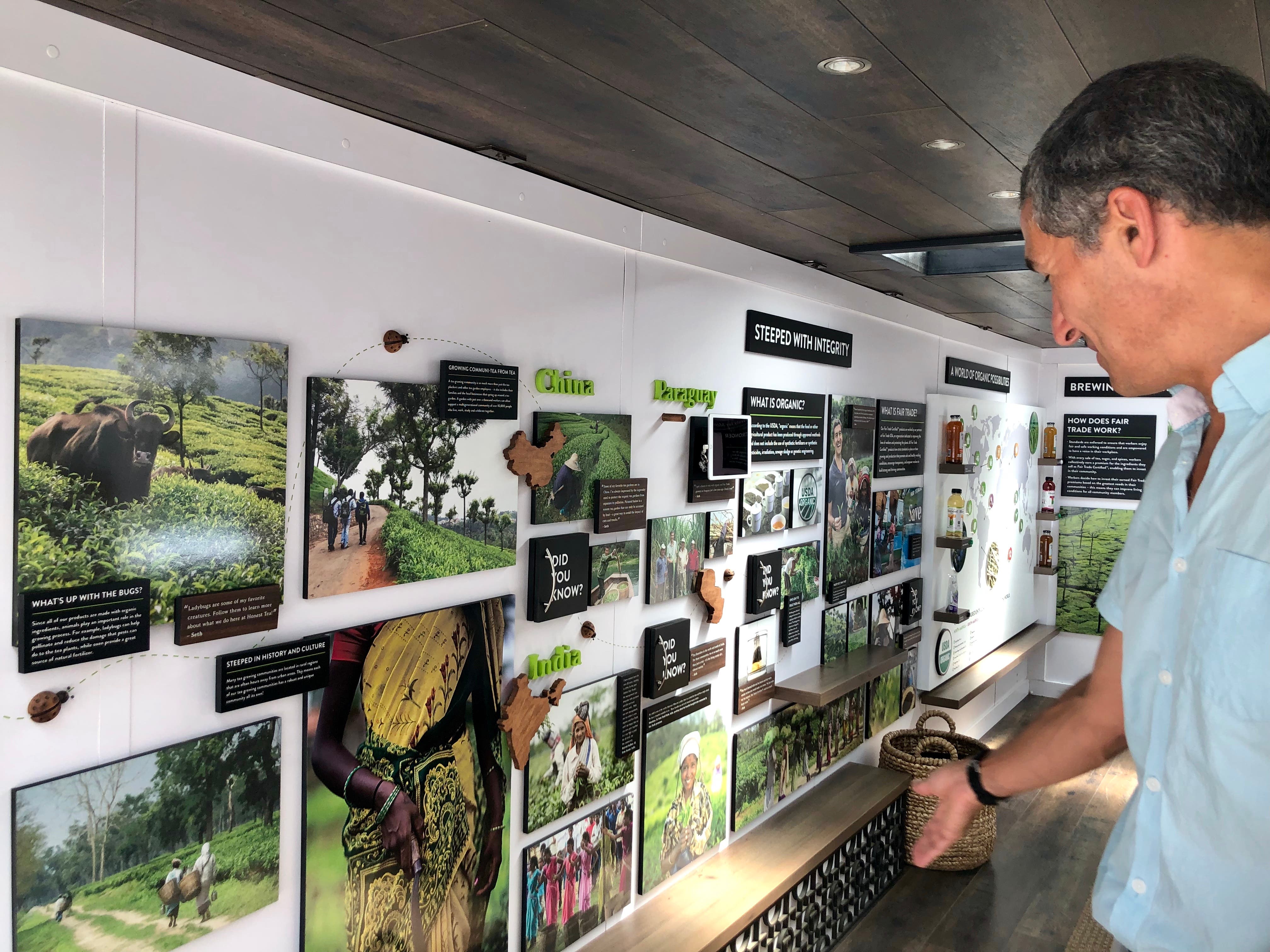 Behind the stand is a silver trailer packed with information about Honest Tea, its process of growing organic tea leaves, and how Fair Trade premiums benefit communities in need.