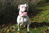 The moment you see Hanny, you can’t help but smile. He’s a goofy, happy dog who greets you with warm enthusiasm and loves every person he meets. Hanny is a young, strong, and active American Bulldog who is around 3 years old and weighs in at a muscular 70lbs. He’s a handsome boy too, with a perfect snow white coat and striking blue eyes. His favorite things in life are being with his people, playing tug and fetch, and American cheese.