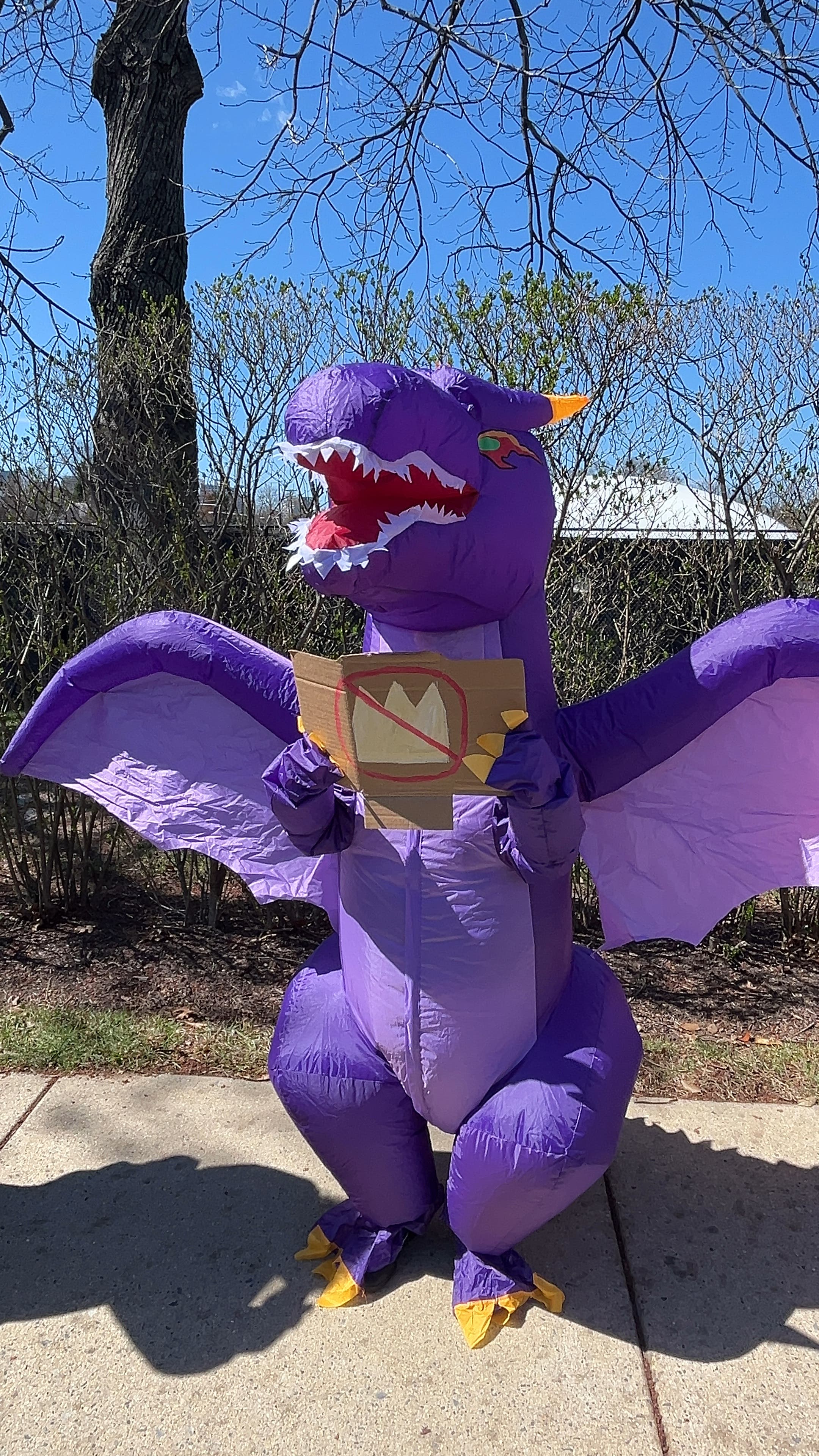 The demonstrator in question was a child who showed up in a winged, purple dragon costume.