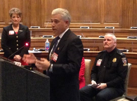 »The parents of slain Montgomery County Police Officer Noah Leotta urge for tougher drunk driving laws; police chief Tom Manger is seated/CNS photo