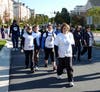 Against a cloudless blue sky, red, white and blue balloons arched over a sea of early morning risers stretching their muscles in preparation of what for some would be an act of honor.