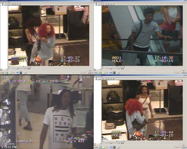 The suspects in the Macy’s case are described as a black male and a black female, about 20 to 25 years old.