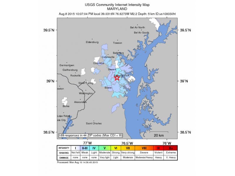 Chris Whelehan commented on our story: “Rockledge section of Bowie... I heard a boom something after or around ten p.m. and remember thinking it was too late for Baysox fireworks! Didn’t feel anything and didn’t associate a boom with an earthquake.”
