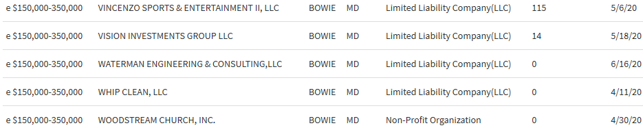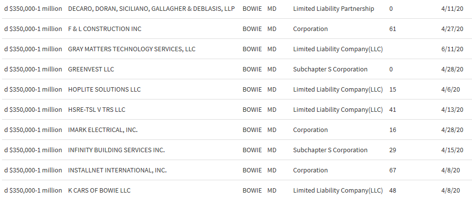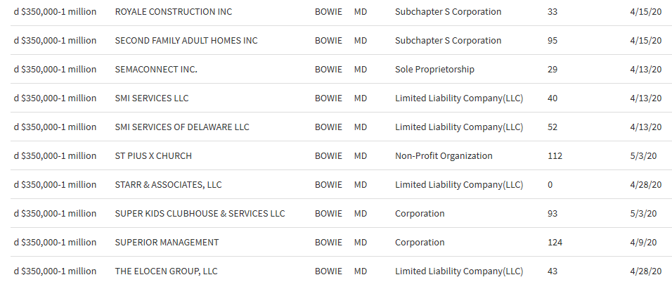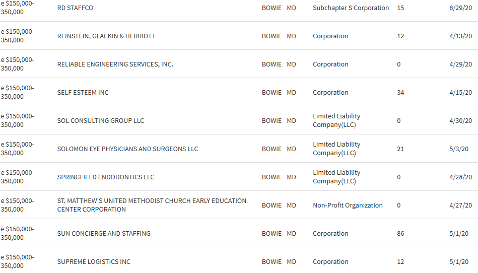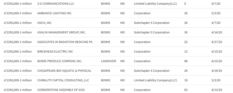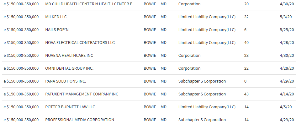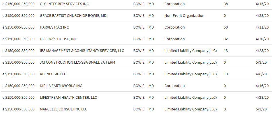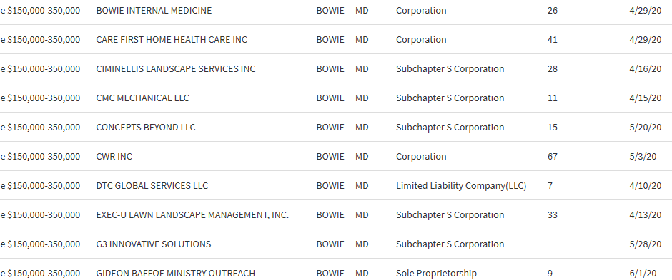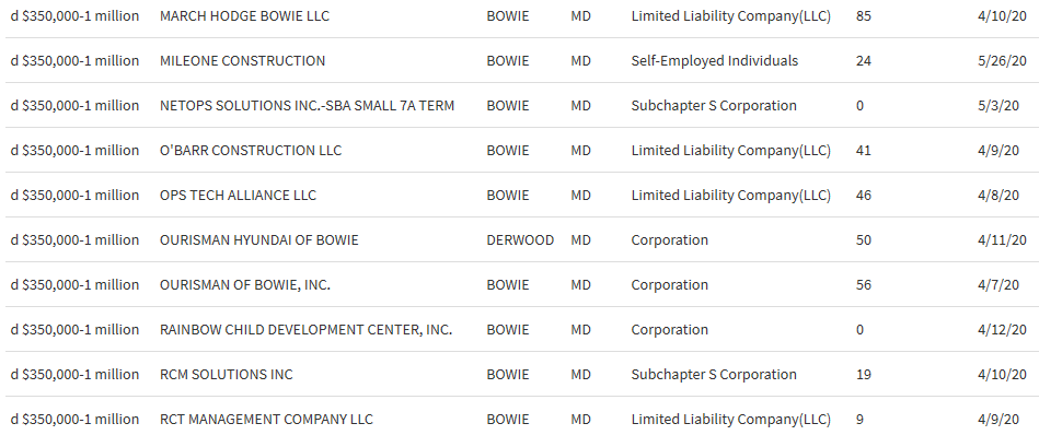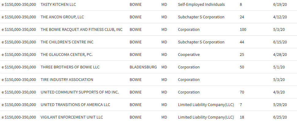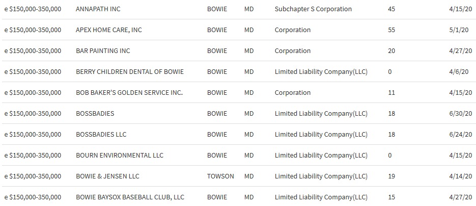 Most loans were worth less than $150,000, but the U.S. Small Business Administration announced all the companies that were awarded more than that threshold. Altogether, 121 Bowie businesses received loans worth more than that $150,000 mark.