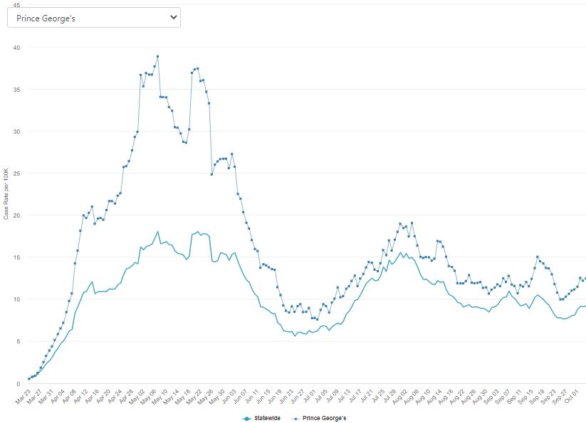 The most recent data clock Prince George's positivity rate at 4.78 percent, which is 1.76 percent higher than the statewide clip. The county's percent positivity has taken a steady hike since it eased to a pandemic-low of 3.46 percent on Sept. 24.