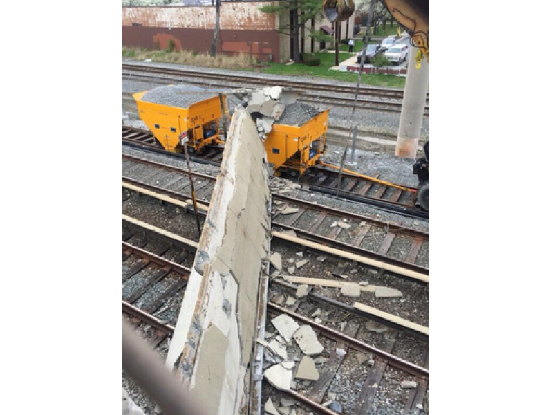 A portion of the concrete bridge fell onto the Green Line tracks in the 5100 block of Berwyn Road shortly before 3 p.m. today after being hit by the boom of a rail crane operated by a Metro contractor, according to a news release.