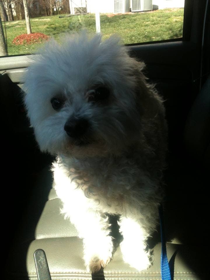The dog is described as a Malti Poo, spayed, 8-10 years old, all white, with no collar or identification.