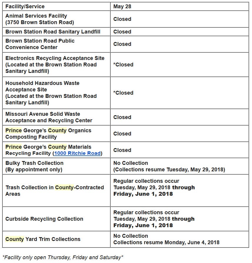 But with Memorial Day comes the annual question of: just what exactly is open on this holiday, and what is going to be closed in the Prince George's County area?