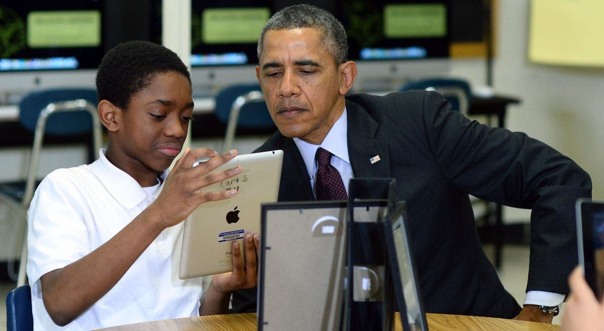 Below: Then-President Obama visits Buck Lodge Middle School in Adelphi.
