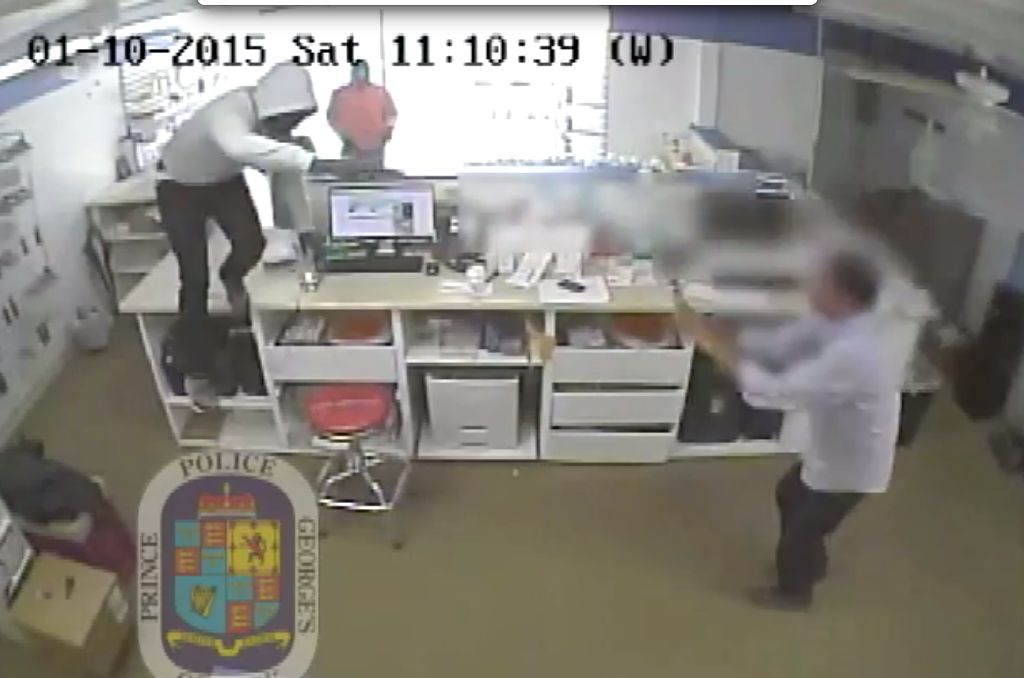 Three robbery suspects can be seen climbing over the counter of a District Heights pharmacy in surveillance video recently released by the Prince George’s County Police Department.