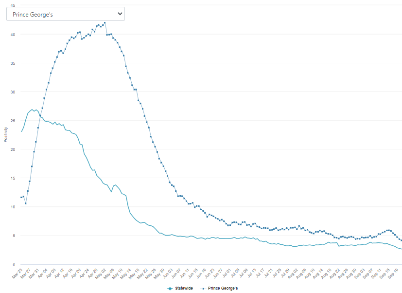 Prince George's County first achieved this benchmark on Aug. 20. It remained under the 5-percent goal until Sept. 9.