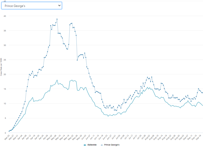 A second surge spiked Prince George's case rate to another peak of 19.04 on Aug. 4. Infections slowed by Aug. 31, dropping the case rate to 10.65.