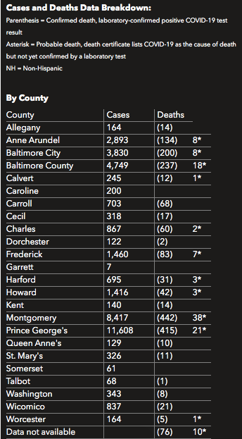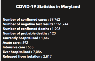 Statewide 39,762 people have tested positive for the coronavirus, according to the Maryland Department of Health, an addition of 958 new confirmed cases in the past day.