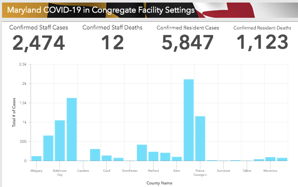 Data about coronavirus at congregate living facilities is updated weekly on Wednesdays, and the newly released information shows more than 200 staff members have tested positive for the virus since a week ago, and one more staff member at a congregate living facility has died from COVID-19, bringing the total staff deaths to 12. More than 500 additional residents have tested positive and more than 100 residents have died since a week ago, bringing the death toll in Maryland's congregate living facilities to 1,123.