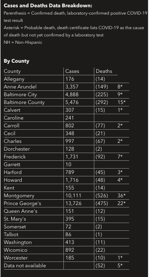 Of those who have died, officials reported Monday morning that 1,001 were residents of Montgomery and Prince George's counties, where 526 and 475 have died from the illness, respectively.