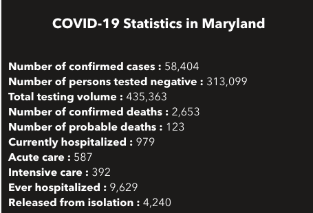In Maryland 58,404 people have tested positive for the coronavirus, state health officials reported Monday morning, an increase of 431 confirmed cases in the past day.