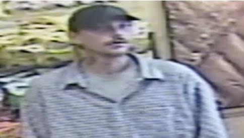 He is described as a white man of average height and weight with a dark mustache, wearing a white buttoned shirt and blue jeans.