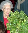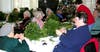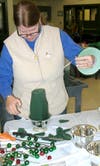 Neighbors Judy Luke and Yvonne Steele agree and in no time full and vibrant boxwood "trees" begin to appear. Meanwhile, Mary, Kin, and Louise are tying tiny ornaments to florist "picks" and passing them out.