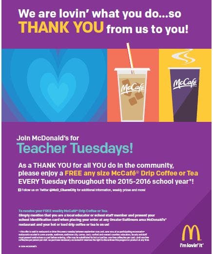 McDonald’s® Family Restaurants of Greater Baltimore will again be saying “Thank You” to local educators with Teacher Tuesdays by offering complimentary any size McCafé Drip Coffee or Tea (hot or iced) every Tuesday throughout the ENTIRE 2015-2016 school year.