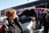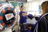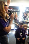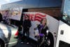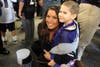 A roar of applause greeted the cheerleaders as they emerged from the bus. But fans were also treated to the team's mascot, Poe, an actual raven. The dressed-up Poe was also there to take snapshots with kids, while the cheerleaders handed out autographs of players and footballs.