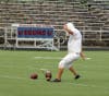 Then with precision, a string of 15 straight field goals fly through the uprights, as a few nearby teammates cheer him on.