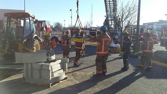 The fire crew placed the man in the rescue basket, and then hoisted it out of the trench with a ladder truck.