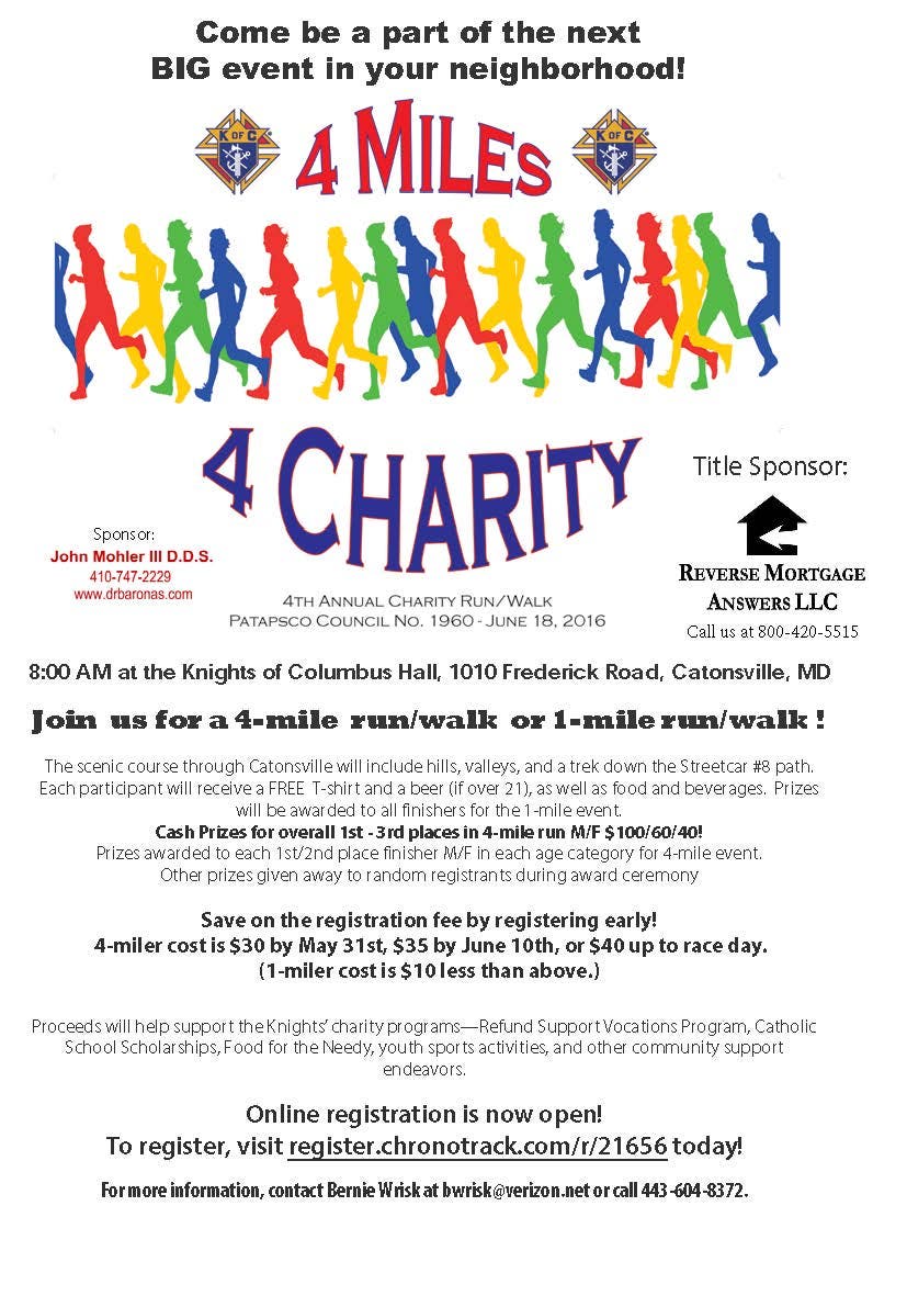 The Knights of Columbus Patapsco Council will hold its 4th annual "4 Miles 4 Charity" event on June 18. Cash prizes for the top runners!