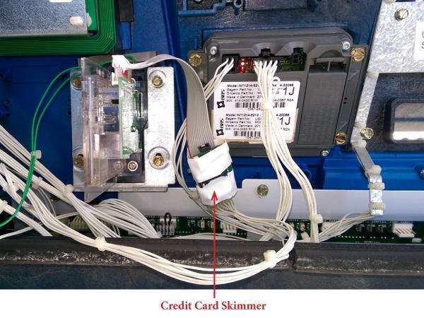 Skimmers are generally placed inside the gas pump cabinets, making them hard to spot before people pay.