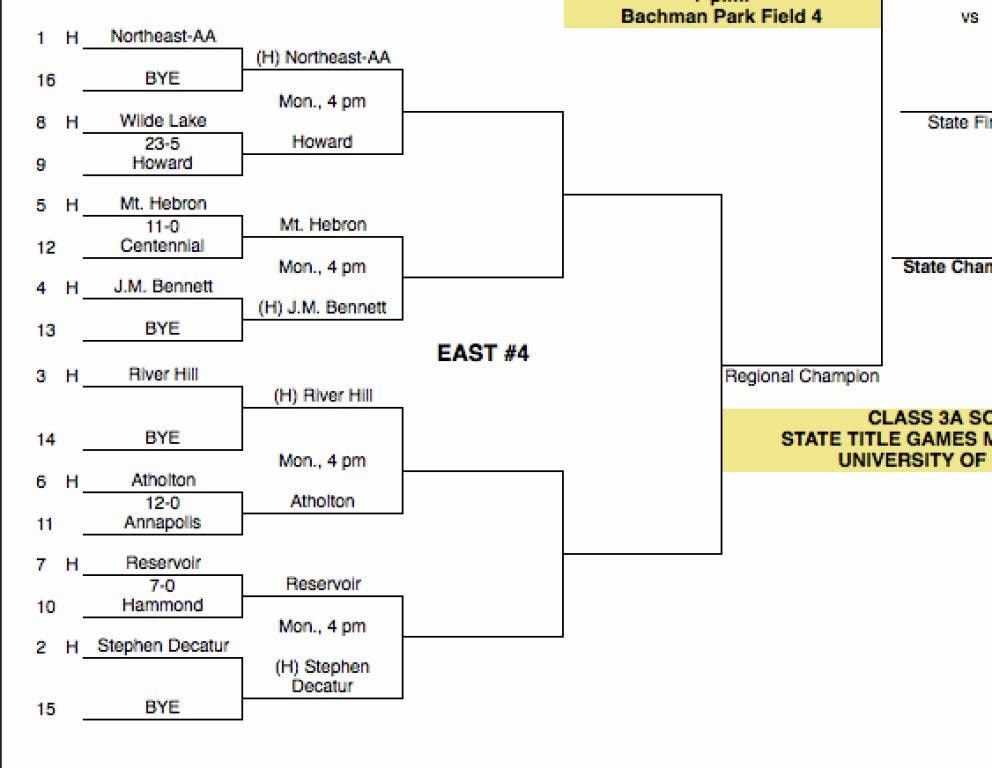 Other 3A winners were Howard, Mt. Hebron and Reservoir. Howard defeated Wilde Lake 23-5 and will face top seed Northeast in the second round. Mt. Hebron upended Centennial 11-0 and Reservoir shutout Hammond 7-0.