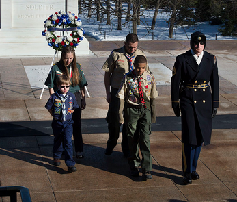 Pictured, Lucas Hines (center, front) visits the Tomb of the Unknown Soldier. Photo Credit: Boy Scouts of America.