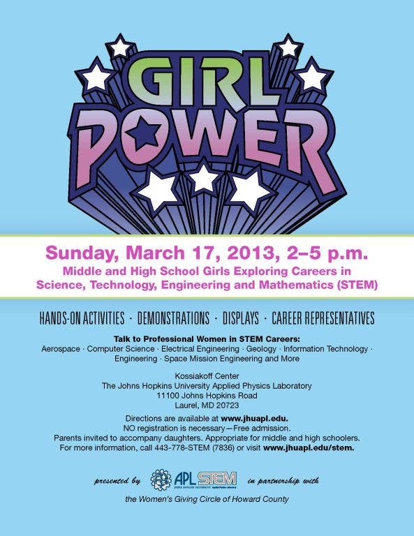 The Johns Hopkins University Applied Physics Laboratory (APL) is hosting a free introduction to careers in science, technology, engineering and math (STEM) for middle and high school girls on Sunday, March 17, from 2-5 p.m. on APL’s Laurel, Md., campus. “Girl Power” is a partnership between APL, the Women’s Giving Circle of Howard County and the Maryland Space Business Roundtable. The sixth annual Girl Power event attracted more than 1,000 girls and family members last year.