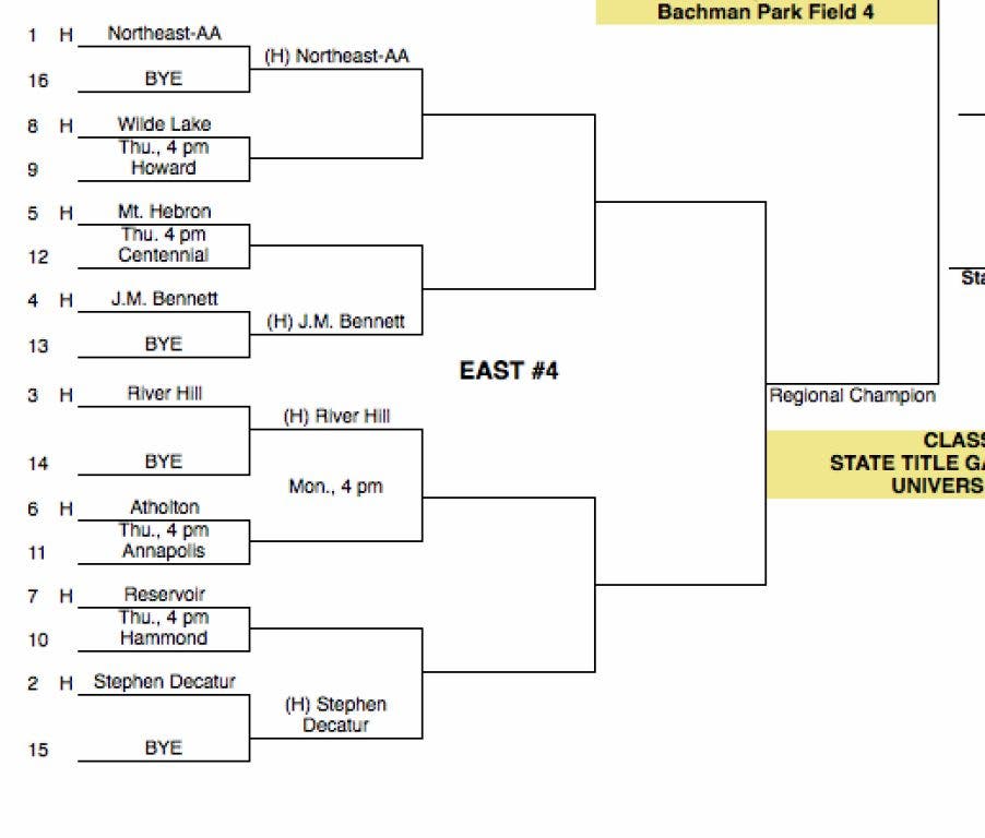 In the Class 3A tournament, fifth-seeded Mt. Hebron will host 12th-seeded Centennial, seventh-seed Reservoir will face 10th-seed Hammond and eighth-seed Wilde Lake will battle ninth-seed Howard. Mt. Hebron defeated Centennial in both of the previous meetings this season, by scores of 16-2 and 10-0, respectively. Though Reservoir received the higher seed, Hammond has defeated the Gators twice.