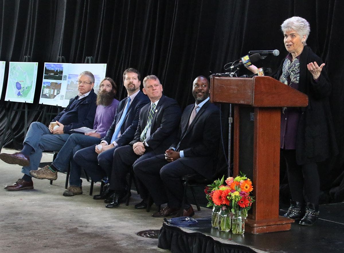 The transfer of Merriweather Post Pavilion from The Howard Hughes Corporation to the non-profit Downtown Columbia Arts and Culture Commission (DCACC) included remarks by (from l.) The Howard Hughes Corporation Senior Vice President for Development John DeWolf, DCACC Executive Director Ian Kennedy, The Howard Hughes Corporation Vice President for Development Greg Fitchitt, Howard County Executive Allan Kittleman, Howard County Council Chairman Dr. Calvin Ball and Howard County Council member Mary Kay Sigaty. Kennedy, who has been growing a beard in anticipation of the transfer, received a ceremonial shave at the end of the festivities.