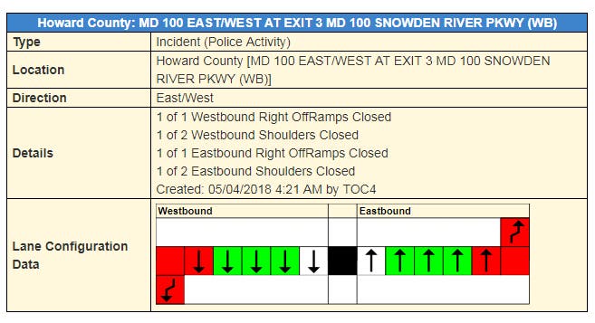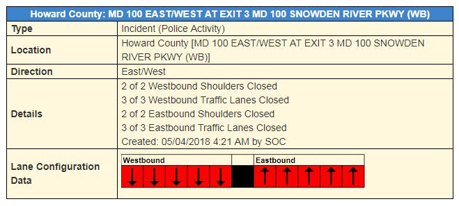 PREVIOUS REPORT — All lanes of MD 100 were closed due to police activity Friday morning in Howard County. The shutdown occurred in the area of Snowden River Parkway, the Maryland State Highway Administration reported, and it lasted less than an hour.