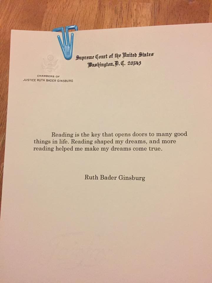 To show her gratitude, Michele Threefoot sent a reply: "Dear Justice Ginsburg, Thank you for the letter. It made me happy because you said I look just like you. I will keep it forever. It is special to me. I promise to keep reading and learning. From, Michele."