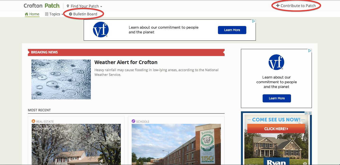 Two user-interaction opportunities are found on the home page of every Patch. They’re circled in red: “Bulletin Board” and “Contribute to Patch.” (Screenshot: Patch.com)