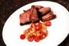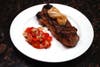 I had an onion on hand so I seasoned it with my grill rub spices and grilled it with the meat until it was slightly charred, tender and almost translucent. I took a portion of it as a garnish for my New York Strip, twisting the onion rounds into a figure eight. The remainder of the onion was chopped and added with sliced grape tomatoes to make a side dish.