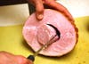 Using a sharp knife, begin to gently slice your ham about a 1/2-inch thick using long, unforced sweeps of the knife. As you cut the pieces, leave them in place until you have finished slicing your entire ham half. Carefully move your cut half to your serving platter and gently fan your slices out.